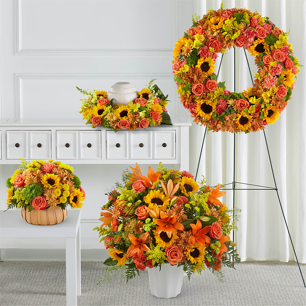 • The Premium Bundle includes our Harvest Sunflower Basket, Harvest Thoughts Floor Basket, Autumnal Memories Wreath, and Faithful Sunflower Cremation Adornment.